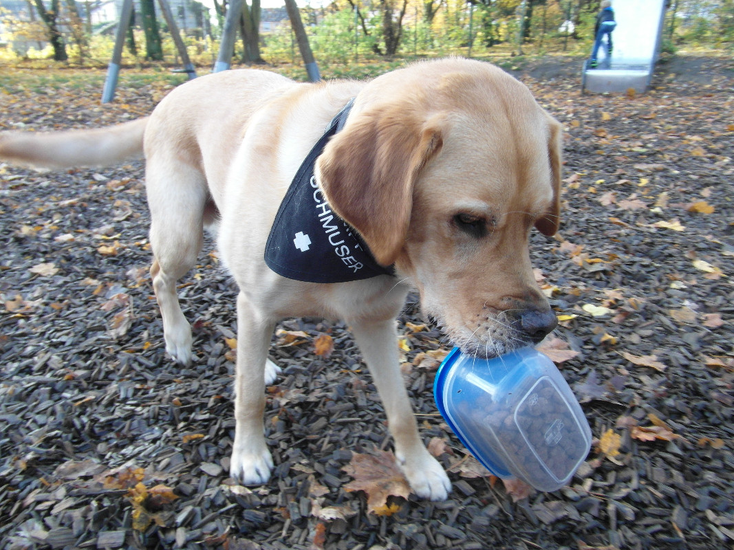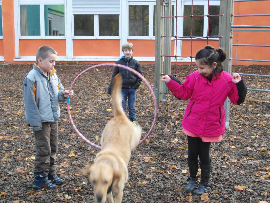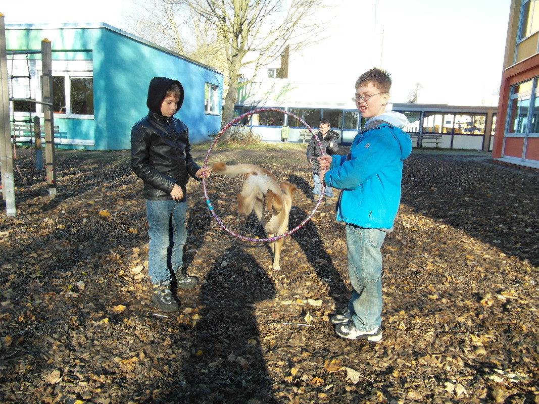 - Mit der Donnerstagsgruppe (Förderbedarf emotionale und soziale Entwicklung und Sehen) geht es auf den Schulhof, Leckerchen verstecken und Gegenstände suchen. Die Jungen müssen die Kommandos laut, bestimmt und deutlich geben.